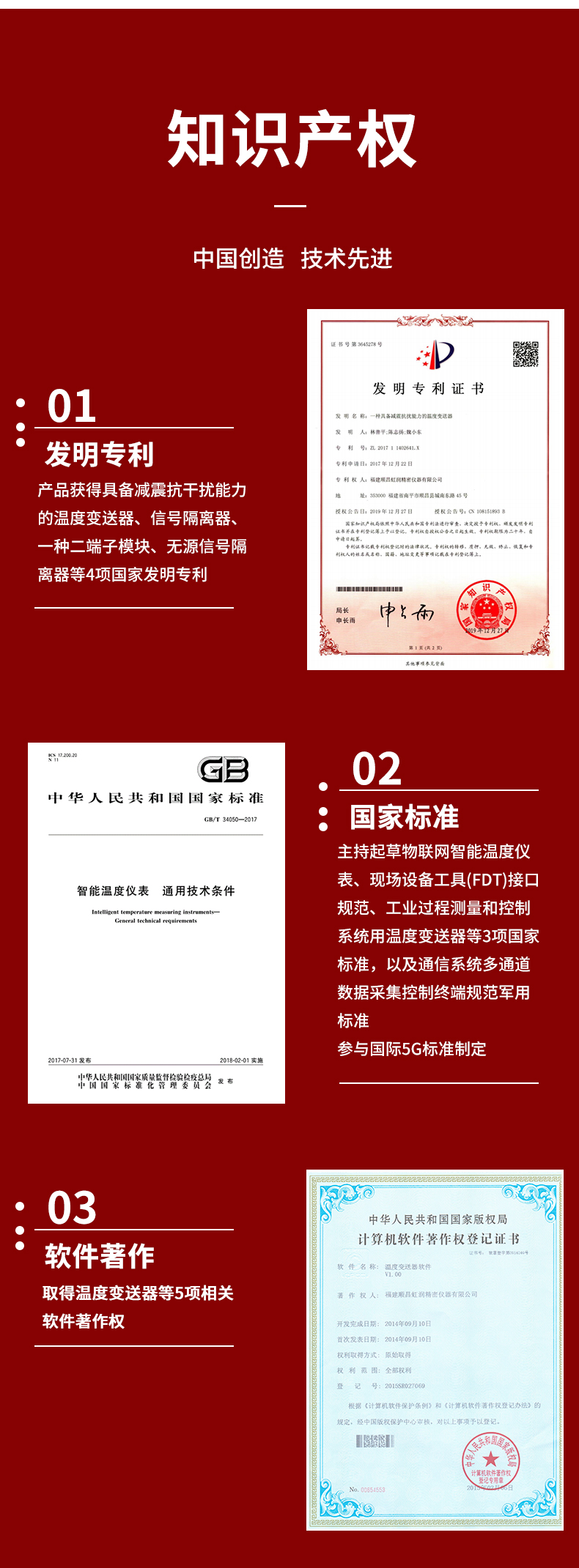 虹潤公司是專業(yè)生產(chǎn)溫度變送器的國家專精特新“小巨人”企業(yè)。生產(chǎn)的溫度變送器,具有采用磁隔離技術(shù),配套編程器可修改參數(shù),抗干擾能力強(qiáng),穩(wěn)定性好,帶RS485或HART通訊等特點(diǎn)。該產(chǎn)品不僅通過HART基金會(huì)認(rèn)證、德國萊茵 CE 認(rèn)證與 SIL 功能安全認(rèn)證,還獲得具備減震抗干擾能力的溫度變送器、信號(hào)隔離器、一種二端子模塊、無源信號(hào)隔離器等4項(xiàng)國家發(fā)明專利,主持起草物聯(lián)網(wǎng)智能溫度儀表、現(xiàn)場設(shè)備工具(FDT)接口規(guī)范、工業(yè)過程測量和控制系統(tǒng)用溫度變送器等3項(xiàng)國家標(biāo)準(zhǔn),以及通信系統(tǒng)多通道數(shù)據(jù)采集控制終端規(guī)范軍用標(biāo)準(zhǔn),參與國際5G標(biāo)準(zhǔn)制定,取得溫度變送器等5項(xiàng)相關(guān)軟件著作權(quán)。產(chǎn)品廣泛應(yīng)用于石油、電力、化工,冶金、制藥、紡織、橡膠制造等工業(yè)領(lǐng)域現(xiàn)場自動(dòng)化測溫過程。